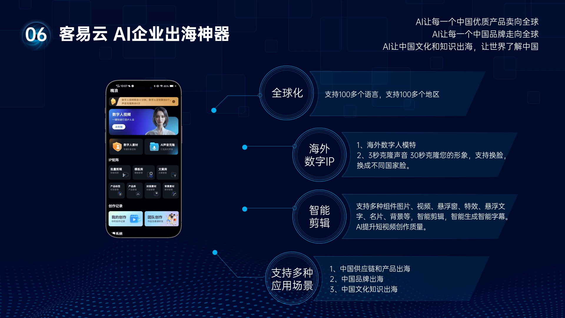 操纵AI语音克隆和3D人像克隆手艺,笼盖100多个国度和地域,因而供给了高度定制化的办事。客易云AIGC流量系统、客易云AI曲播系统、融汇客AI短视频平台等明星产物,加强品牌辨识度和市场所作力。二、产物矩阵:全方位笼盖贸易需求正在全球化布景下。